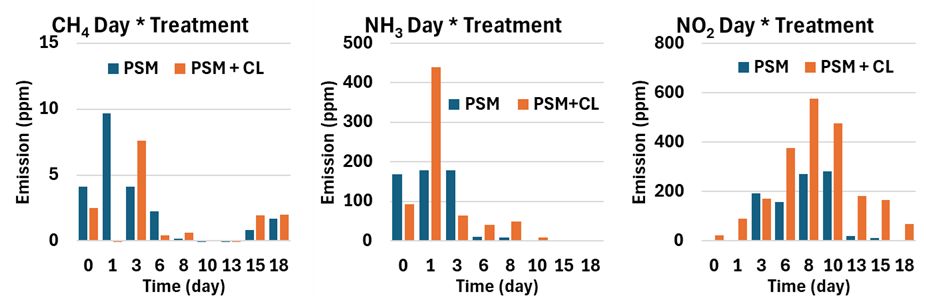 All measured gases showed significant changes over the time of the experiment (p < 0.05). Significant differences between treatments (p < 0.05) were recorded for N2O with a higher emission recorded for PSM+CL. Significant treatment* day interactions were observed for CH4, NH3, and N2O (p < 0.05). Methane and NH3 emissions peaked on day 1 and steadily decreased over the 18 days; N2O emissions steadily rose from day 0 to day 8 and then steadily decreased through day 18. Nutrient analysis determined PSM with chicken litter contained significantly higher levels of organic N, ammonium N, and total nitrogen. There was no significant difference of N2O in control vs treated samples. Chicken litter treated samples showed higher levels of P2O5, K2O, sulfur, calcium, magnesium, sodium, zinc, copper, boron, soluble salts, and organic matter. From this work, we conclude that addition of chicken litter to PSM did not favorably alter emissions of greenhouse gasses. Mixing the manures may be beneficial for land application to cropland or for composting.