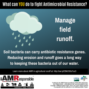 While people often talk about the overuse of antibiotics, it is important to understand that any amount of antibiotics – whether administered to an animal or person, excreted in animal or human waste, or directly introduced to the environment – has the potential to affect the development of antibiotic-resistant bacterial populations. Once antibiotics are excreted in animal manures, they can break down due to environmental factors, such as temperature, sun exposure, moisture, etc. This is why even though there is a known presence of antibiotics in manures that are used for fertilizer, the concentration of antibiotics being spread on fields is not known. Whether manure is deposited directly on the ground by animals or applied to land following some period of storage, the type and conditions of the soil receiving the manure can also impact AMR.