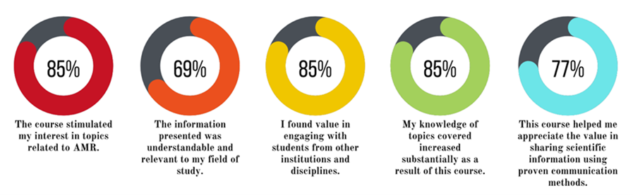 Results from the student focus group in 2020 were highly influential on the expanded instruction for science communication strategies and addition of international emphasis on AMR discussions in subsequent years. Survey results following the second session again highlighted the value the students placed in the instruction on science communication, audience identification, and navigating public attitudes toward AMR, science, and disease. Student participation in Spring 2020 (two institutions) and 2021 (five institutions) totaled 28 students. Evaluations by students revealed the following outcomes: