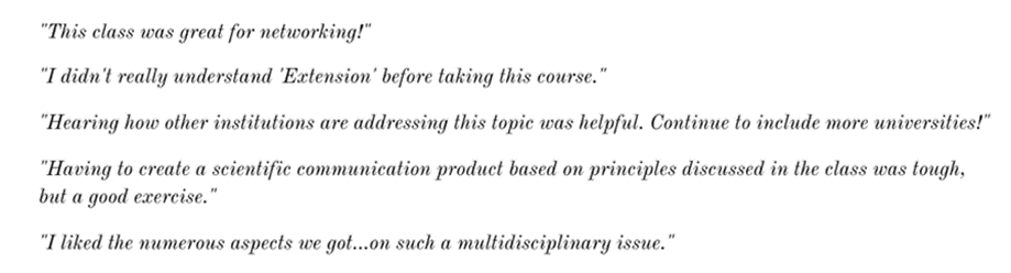 We believe that the results of the students’ evaluations indicate that the next generation of STEM professionals not only values expertise in extension skills but will actively seek to develop those skills for themselves if given the opportunity. Accordingly, we see a value in pursuing similar courses as part of an extension portfolio.