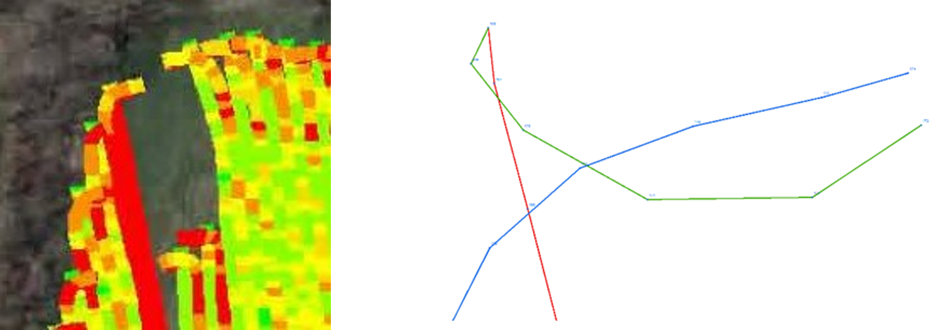 movement during the application. The lines represent the path of the tractor using a dragline to apply manure as it performs a K-turn at the end of the pull. The lines are formed by connecting the GPS coordinates recorded each second. The red line represents the tractor traveling North until it reached the end of the pass. The green line represents the travel path as the tractor backs up to make the K turn. The blue line is the path of the tractor as it again travels forward to complete the turn and head South again. The blue and green lines do not connect because a tractor backed up to some point northeast of the end of the green line, stopped and resumed moving forward again, all during the one-second interval between the ends of the green and blue lines.