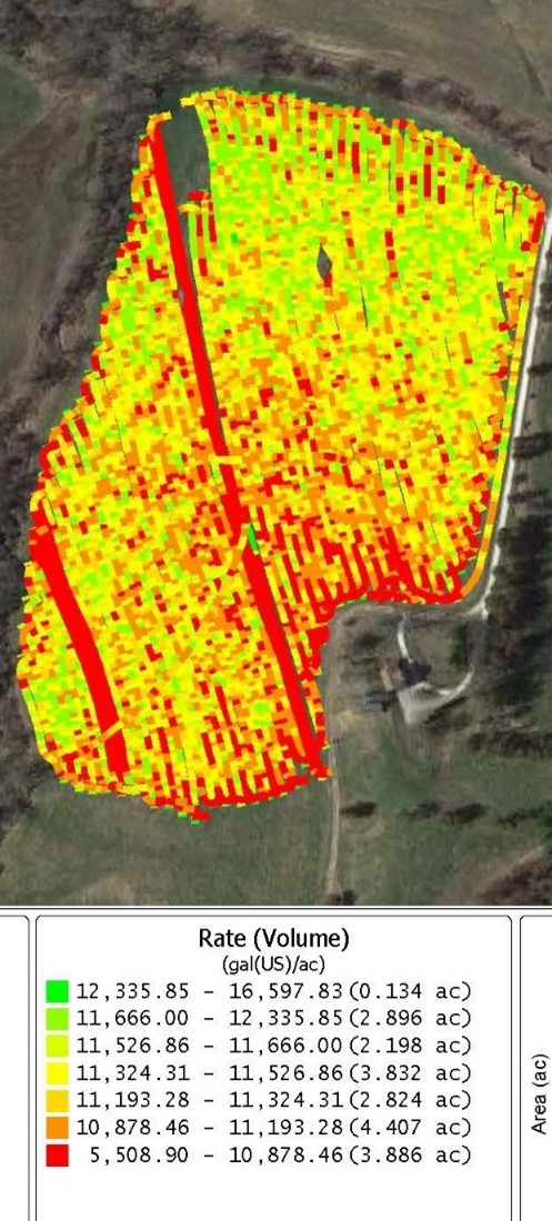 The table above is calculated using the application rates and the areas of the polygons in the as-applied map. It basically provides a report card of the application. The farm intended to apply 10,000 gallons per acre to meet the fertilizer needs of the crop. We placed an arbitrary interval of 2,500 gallons above or below the target rate as an acceptable variation in the application rate. This allowed us to calculate that ~15.6% of the area applied received the “correct” rate. Approximately 6.7% of the area received too little manure and 77.7% of the area received too much manure. In addition, we calculated that the small area on the inside of the turn that received the most manure per acre received 103,383 gallons per acre, rather than the desired 10,000 gallons per acre.