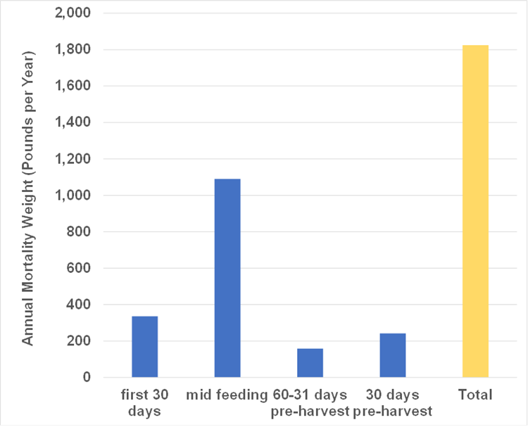 A total confinement beef feedlot was used to model mortalities for cattle on feed. Cattle were assumed to grow linearly with cattle placed in the feedlot at 400 to 600 pounds, and leaving at 1,000 to 1,200 pounds with an average time on lot of 120 days. Midwestern data (Vogel et al, 2015) was used to estimate annual deathrates per feedlot space at 30-day increments since placement in the feedlot.