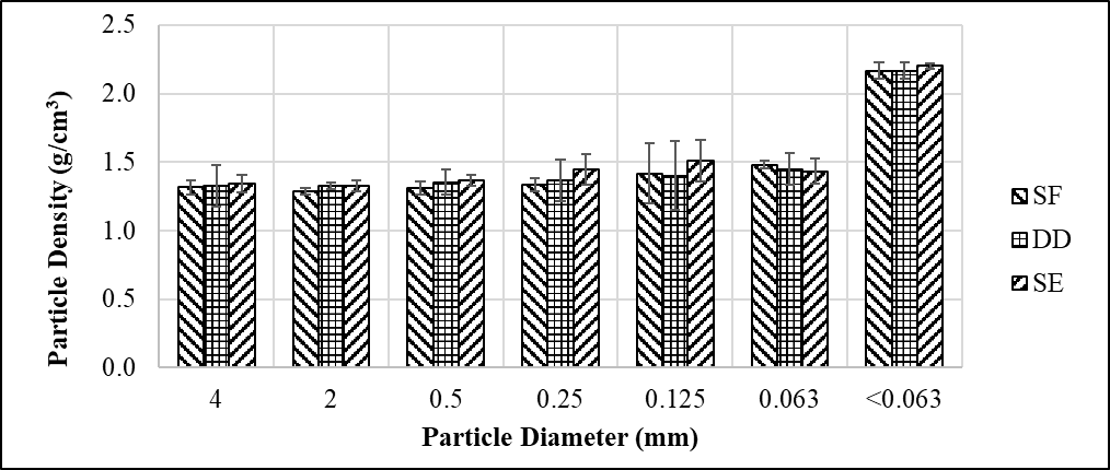 The particle densities of three dairies (Figure 4) were found to be similar ranging from 1.32 g/cm3 for particle sizes larger than 4 mm to 2.20 g/cm3 for particles less than 0.063 mm. The particle densities which are smaller than commonly used soil particle density of 2.65 g/cm3 need to be considered during design of dairy flushing water settling basins.