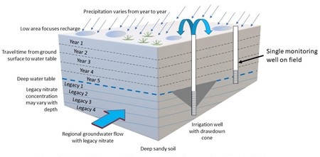Typical groundwater monitoring for nitrate concentrations in single monitoring wells and monitoring- well networks cannot always correctly explain the nitrate distribution in groundwater at the field level. Nitrate can originate from various sources (e.g., chemical fertilizers, manure, etc.) and at various times (e.g., current practice versus legacy nitrate). Nitrate in groundwater can also vary spatially, temporally, and with groundwater flow direction. Figure 1 illustrates some of the causes of spatial and temporal nitrate variations at the field level related to water and dissolved nitrate movement. Figure 2 is one example of how complex geology (e.g., stream meanders) can affect, and complicate, groundwater and nitrate movement.