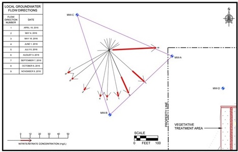 First, we suspected that MW-D, which is located close to the vegetative treatment area (VTA), was not a representative well for groundwater quality due to large, episodic recharge events caused by ponding on the VTA. To test this hypothesis, we installed three monitoring wells just upgradient from MW-D (MW-A, -B, and -C in Figure 3), equipped all four monitoring wells with water-level data loggers, and used these data to calculate continuous groundwater flow direction changes with time. Monitoring wells MW-A, -B, -C, and –D are screened between 28-38, 28-38, 26-36, and 22-32 feet below ground level, respectively, to monitor the water table. The groundwater elevation data and monthly nitrate monitoring (Figure 3) indicated (1) the water table fluctuated significantly and episodically in response to precipitation and ponding on the VTA, (2) the groundwater flow direction changed significantly when ponding occurred (so what is “upgradient”?), and (3) the nitrate concentration changed at upgradient monitoring well MW-A from more than 40 mg/L when regional groundwater flowed onto the site to about 2 mg/L when ponding caused an episodic reversal of the groundwater flow direction.