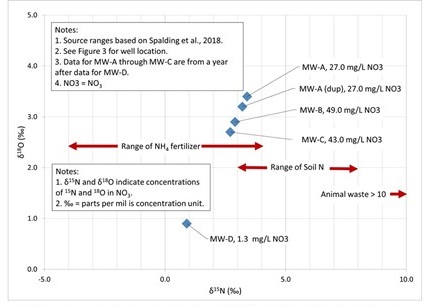 Finally, we tested nitrate (NO3) ions in the groundwater for their 15N and 18O signatures. Nitrate isotopes have been used to distinguish between nitrate sources, such as chemical fertilizer and manure, for more than 20 years. Figure 5 shows the chemical and manure nitrate source fields based on nitrate isotopes. The groundwater at monitoring wells MW-A through MW-C had both isotopic signatures indicative of chemical fertilizer (legacy nitrate) and elevated nitrate concentrations consistent with those reported for the regional groundwater.