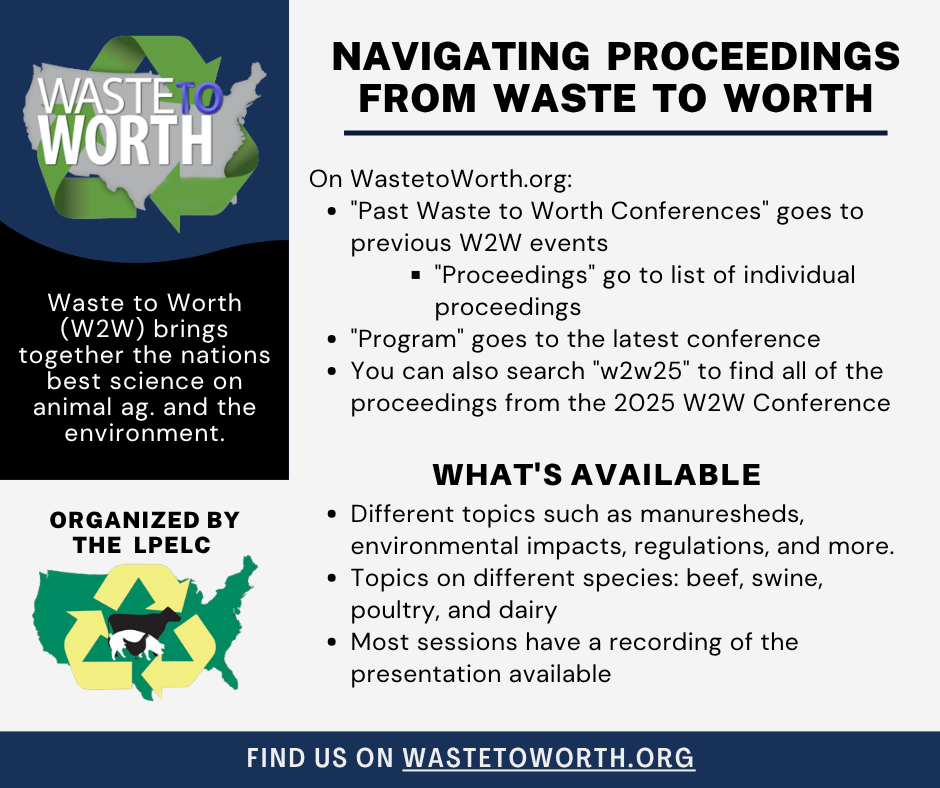 Waste to Worth (W2W) is a biennial conference that brings together the nations best science on animal agriculture and the environment. Find sessions about many different topics including air quality, manure management, environmental impacts, and more!