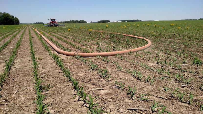The application of livestock manure to farm fields has always been an expense for producers. On-farm research plots were assessed in Ohio following application of liquid swine and liquid dairy manure using drag hoses to provide side-dress nitrogen to emerged corn. A six-inch diameter drag hose was used to side-dress corn with swine finishing manure at the V3 stage for four crop seasons. The manure was incorporated at a rate of 6,500 gallons per acre to replace purchased commercial side-dress nitrogen. Plot yield results indicated liquid swine manure produced higher yields when compared to 28% urea ammonium nitrate fertilizer when applied at similar nitrogen levels and the cost savings on purchased fertilizer paid for the manure application cost. The use of liquid manure to sidedress corn can provide a new window of time for manure application in Ohio and apply manure when the nutrients could be utilized by a growing crop.