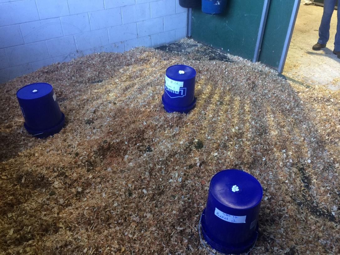 Background (cleaned stalls without bedding material; rubber mats only) and baseline (bedded stalls) NH3 concentrations were < 5 ppm and not different between SB and CON stalls. NH3 concentrations had a cumulative effect and were greater on day 3 (69.8 ppm) compared to day 1 (< 5 ppm) and day 2 (16.7 ppm). NH3 concentrations were greater in CON stalls (28.6 ppm) compared to SB stalls (< 5 ppm). Bedding pH was lower in SB stalls (1.82) compared to CON stalls (6.16) demonstrating an overall treatment effect, but pH of the bedding increased over the duration of the study. The number of flies caught in traps did not differ between treatments, although fly counts did increase over time. Reductions in pH and NH3 observed in the present study were comparable to previous studies. We expected reductions in flies in stalls treated with SB, however, fly counts were extremely low overall and a different approach for quantifying fly numbers may be necessary.
