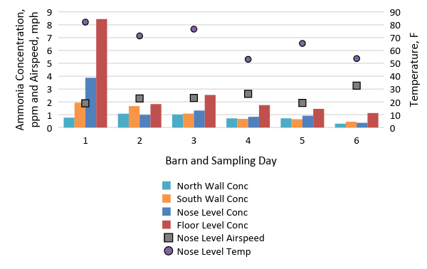 We measured ammonia concentrations among four pens in three beef cattle barns oriented east and west with deep pit manure storage during summer and fall conditions in Minnesota. We measured the concentration below the slatted floor (above the manure surface), 4-6 inches above the floor (floor level) and 4 ft above the floor (nose level). While collecting samples from within a pen, we also collected samples from the north and south wall openings surrounding the pen. We collected air and surface temperatures, air speed at cow level, and surface manure samples to supplement the concentration data. We collected measurements three times between 09:00 and 17:00 on sampling days. The cattle (if present) remained in the pen during measurement collection.