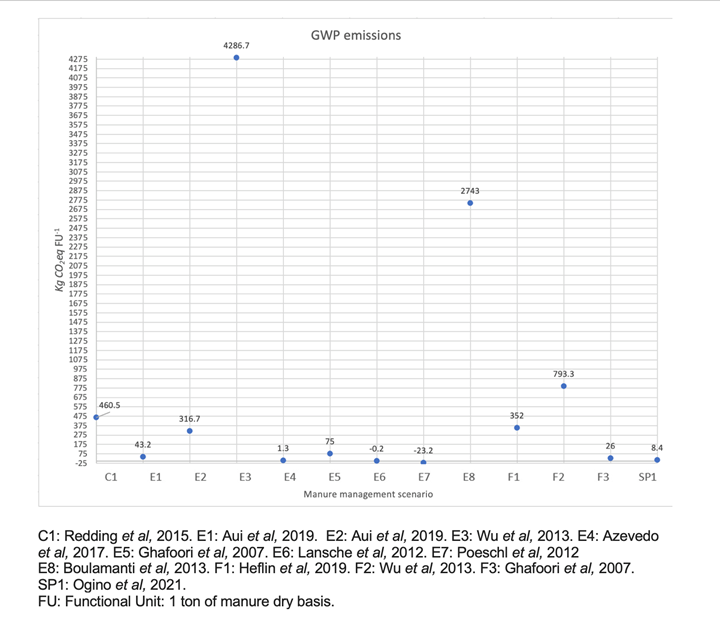 The difference between emissions between different manure management systems can be as extreme as 4,000X depending on system boundaries, allocation procedures, emission factors, environmental credits, amongst others. When evaluating a manure management system, it is necessary to consider every stage and so that emission reduction can be addressed in the whole process hotspots and not only during the transformation of organic matter.