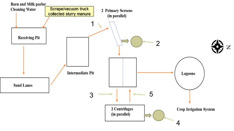 Figure 1. Liquid manure flow diagram (liquid manure samples were collected at points 1 (before screens), 3 (after screens), and 5 (after centrifuges), solid samples were collected at points 2 (screen separated solids) and 4 (centrifuge separated solids).