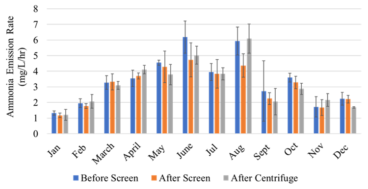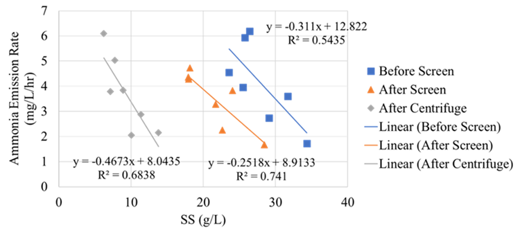 In Figure 11 a correlation was determined between ammonia emission rate and suspended solids. As suspended solids were reduced within liquid dairy manure the ammonia emission rate increased among the treatments.
