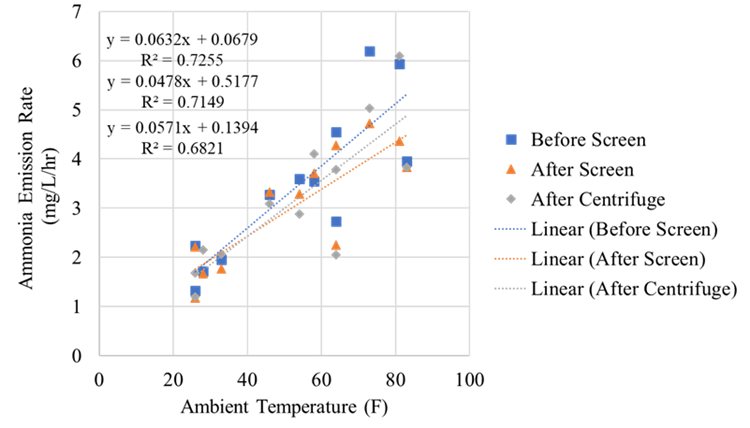 In Figure 12 a correlation was determined between ammonia emission rate and ambient temperature. As the ambient temperature increased, so did the ammonia emission rate among the treatments.