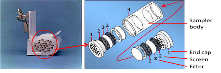A year-long evaluation of on-farm centrifuges and screens on removing solids and nutrients and affecting ammonia emissions from centrifuge- and screen-separated liquid dairy manure was conducted. Triplicate fresh liquid dairy manure samples were collected monthly from before and after screens and centrifuges on a commercial dairy meanwhile triplicate screen- and centrifuge separated solids were collected from the same dairy. Figure 1 shows the dairy’s liquid manure flow diagram and locations where the liquid and solid manure samples were collected. The collected solids were analyzed for nitrogen (N), phosphorus (P), and potassium (K) concentrations by a certified commercial laboratory. The collected liquid samples were analyzed for total and suspended solids based on Methods 2540B and D (APHA, 2012) in the Waste Management Laboratory at the UI Twin Falls Research and Extension Center. Ammonia emissions from the monthly collected liquid dairy manure were evaluated using Ogawa ammonia passive samplers outside the Waste Management Lab for a year. Ammonia emission rate was calculated based on the duration and NH4-N concentrations from the Ogawa ammonia passive sampler tests. Ogawa passive ammonia sampler and Quickchem 8500 analysis system are shown in Figures 2 and 3.