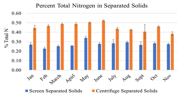 Figure 5. Total nitrogen in screen separated and centrifuge separated solids.