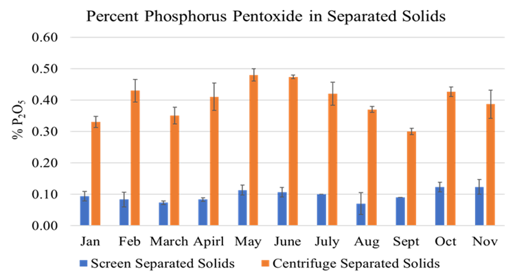 Figure 6. Phosphorus in screen separated and centrifuge separated solids.