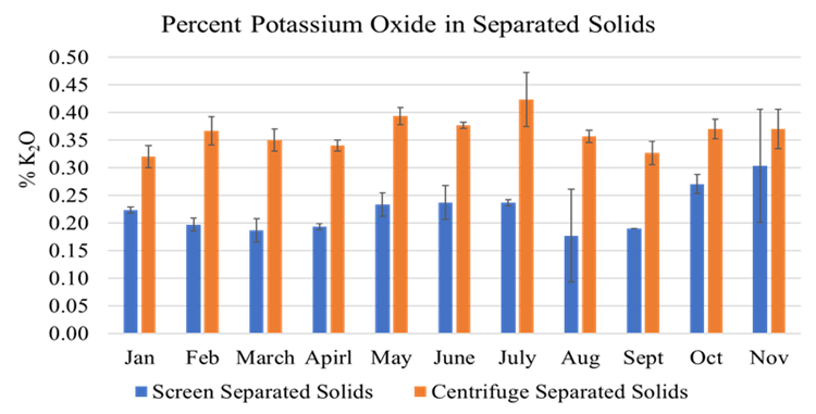 Figure 7. Potassium in screen separated and centrifuge separated solids.