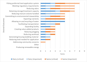 Allowing water to be reused and exporting nutrients were the primary desired outcomes of implementing manure treatment technologies for dairy and swine farms, respectively (Figure 4). Accordingly, 6 of 7 dairy farms were recycling water in their operations, while only 1 out of 10 was doing so on the swine side.