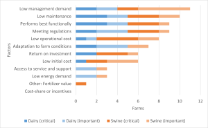 Diverse factors influenced the selection of the implemented technologies in both livestock operations. Low management demand, low maintenance, “performs best functionally” (best performance achieving the desired goals of manure treatment), and low initial cost are among the most-mentioned factors (Figure 5).
