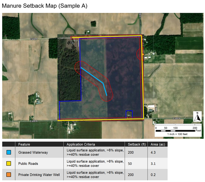 After setting up field boundaries, the TSP will navigate a wizard-like process to create a “Feature Map” including wells, streams, water control structures, facilities, and roads. Then, the TSP can create a “Manure Setback Map” (below), by specifying the manure application practice(s) associated with each feature. As each selection is made, MyFarms dynamically calculates the setback area surrounding the feature so the user can easily see the relationship between the application practice, the setback distance, and the setback area.