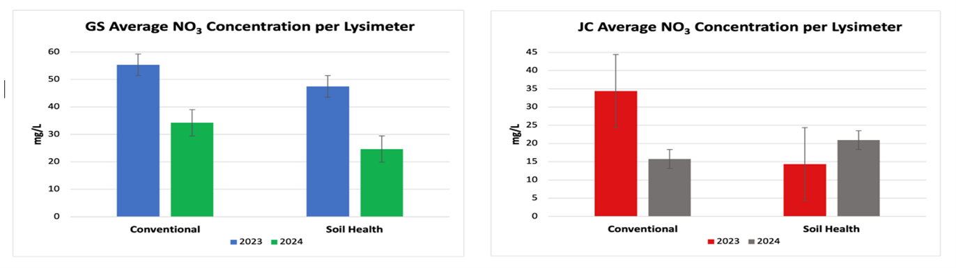 On the GS Farm, the leachate from the soil health treatment had, on average, a lower nitrate concentration. There was also less leachate produced, and less total nitrate going past the soil root zone. On the JC Farm in 2023, the soil health treatment also produced leachate with a lower nitrate concentration than their conventional treatment. There was also less total leachate produced and less total nitrate loss when cover crops were interseeded into the corn in 2023. Those results disappeared in 2024 when a cover crop was not planted. Even with the cover crop, the leachate (on average) exceeded the drinking water standard for nitrate concentration. The application of manure in the spring likely contributed to this loss.