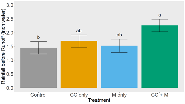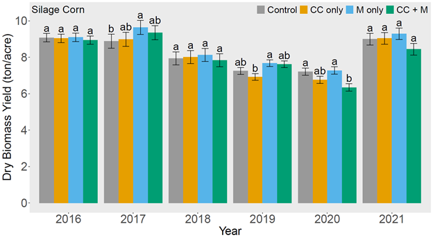From this research, we found that the use of winter cover crops and fall applied solid dairy manure did not improve soil water storage in the semi-arid and calcareous soils in Southern Idaho. Soil water storage tended to be lower in the CC + M plots (Figure 1). The CC + M plots were able to infiltrate more water prior to runoff than the control plots, suggesting that the CC + M plots are drier (Figure 2). Infiltration, runoff, and saturated hydraulic conductivity did not improve with the treatments and remained similar to the control plots. Although some research has shown improvements in soil moisture, soil physical properties, and dry biomass yield when using reduced tillage practices, there were no differences between reduced tillage and conventional tillage. Silage corn yields tended to be highest in the M only plots and lowest in the CC + M plots, however there were no treatment differences in three of the six years of the study (Figure 3). Using triticale as a winter cover crop would be beneficial to increase total dry biomass yields in dairy systems that would like to increase their forage production, however it is not advised if a producer is only looking to increase silage production.